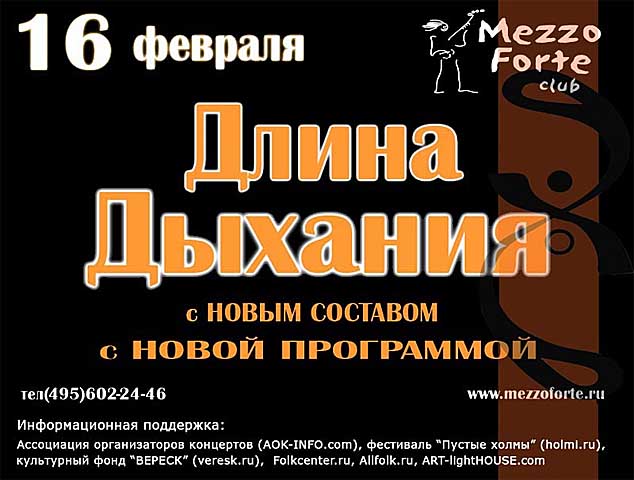 "Длина дыхания" - это не просто музыкальная группа, это образ жизни, это способ взаимодействия с окружающим миром, мировоззрение. Потому и наши концерты - больше, чем просто концерты; при всей своей искренности, теплоте и открытости, они являются ещё и неким обрядом, церемониалом единения людей, которые с любовью дышат одним воздухом и живут на планете Земля. Мы учимся так дышать, чтобы, как говорил Александр Башлачёв, "душу не душить". Музыка и тексты группы не привязаны к конкретным временам и социальным проблемам, не ограничены узкими жанрами и стилями, они - о вечном, о том, что важно для любого думающего и глубоко чувствующего человека, готового честно и открыто смотреть на мир и на самого себя. В феврале группе исполняется год. За это время мы играли в разных стилях, пробовали разное звучание. Сейчас, наконец, сплотился и сыгрался такой коллектив, при котором группа обрела свой звук, свой неповторимый стиль... На данный момент в составе "Длины Дыхания": Максим Гришин - вокал, акустическая гитара, губная гармошка, горловое пение, автор песен. Мариан Калдарару (Марио) - перкуссия. Марат (Злой волшебник Джафар) - бас. Семен Лившиц - ударные. Приходите! Будем вместе свободно дышать песнями, музыкой, словами, любовью! Начало в 20:00. Вход - 300 руб. Клуб "Меццо Форте" Адрес: Ул. 1-я Останкинская стр. 53 (Торговый Центр) метро "ВДНХ" Тел.: 602-24-46 http://www.dd-music.ru http://www.3planet.org http://www.vkontakte.ru/club9153633 Встреча ВКОНТАКТЕ http://vkontakte.ru/event14768747 |
