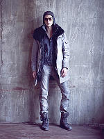 Но это еще не все. Одна из «фишек» GJO.E — необычный способ окрашивания. Сложно поверить, но большинство вещей шьются из белой ткани (и не важно, натуральное это волокно или hi-tech — тем интереснее результат), а затем окрашиваются в несколько этапов, обрабатываются пигментами, выцвечиваются агрессивной стиркой (stonewash или enzymewash). Около 30% вещей после обработки выбраковываются — при всем совершенстве технологий, натуральная кожа и хлопок — материалы капризные и непредсказуемые. Зато на выходе — сложный, неоднородный, «состаренный» цвет, по которому эксклюзивную вещь отличаешь с первого взгляда.