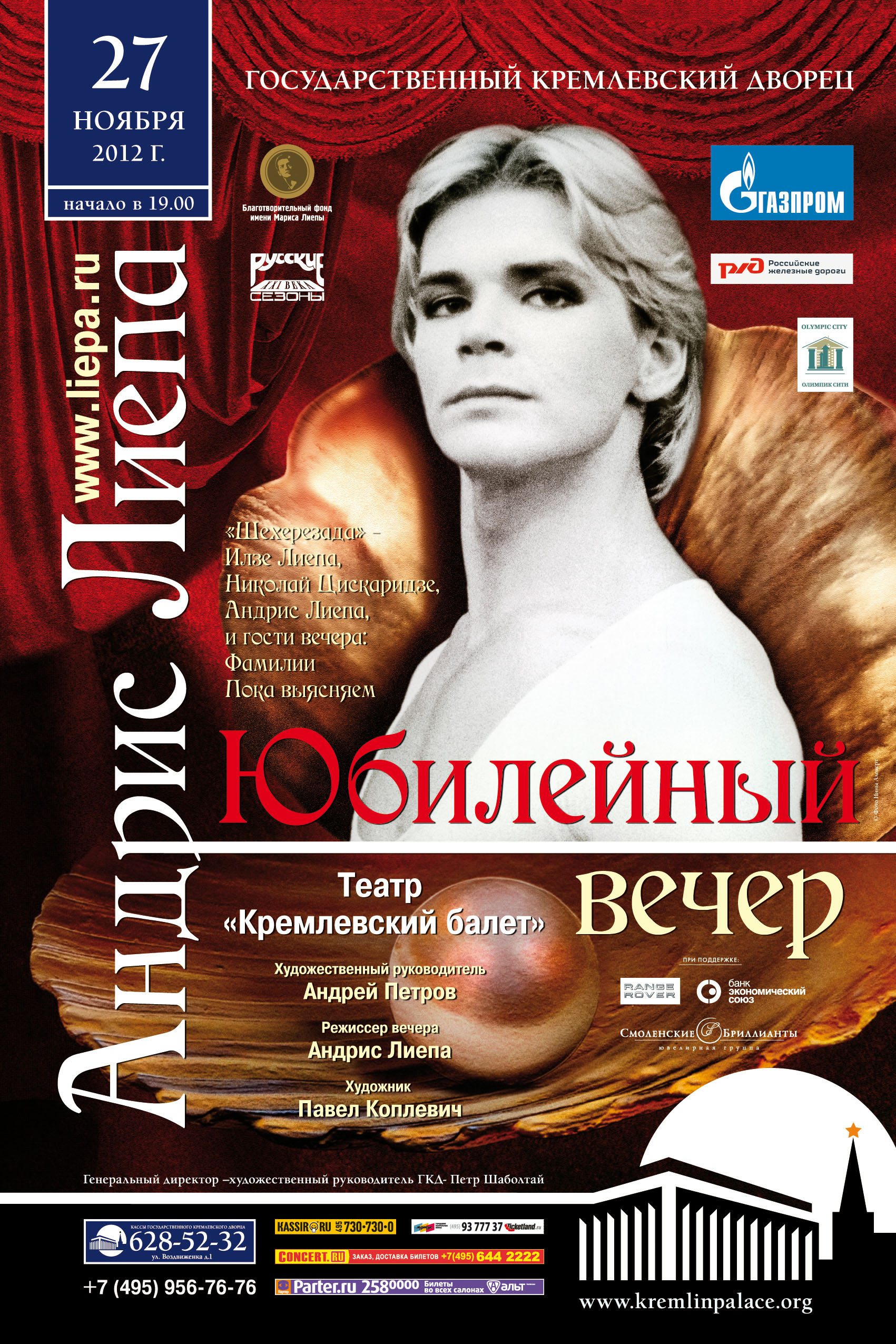 Творческий вечер народного артиста России Андриса Лиепы, посвященный его 50-летнему юбилею, состоится на сцене Государственного Кремлевского Дворца 27 ноября 2012 года.