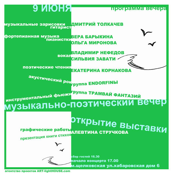 художника-стилиста АЛЕВТИНЫ СТРУЧКОВОЙ ГРАФИЧЕСКИЕ ИЛЛЮСТРАЦИИ И ПРЕЗЕНТАЦИЯ КНИГИ СТИХОВ А.Н. КОЦОНИСА «Мне есть за что благодарить Тебя, Господь…» В ПРОГРАММЕ принимают участие: гитарист ДМИТРИЙ ТОЛКАЧЕВ певец ВЛАДИМИР НЕФЕДОВ пианистка ОЛЬГА МИРОНОВА пианистка ВЕРА БАРЫКИНА певица СИЛЬВИЯ ЗАВАТИ поэтесса ЕКАТЕРИНА КОРНАКОВА Special Guests: группа ТРАМВАЙ ФАНТАЗИЙ группа ENDORFINЫ ПОЭТИЧЕСКИЕ ЧТЕНИЯ авторы стихов: Анатолий Коцонис Екатерина Корнакова Алевтина Стручкова Кирилл Лосев Ольга Долгих сбор гостей к 16.30 начало концерта в 17.00 Ждем вас по адресу: м. Щелковская, ул. Хабаровская дом 6 ИНФОРМАЦИОННАЯ ПОДДЕРЖКА: ГБУК «Московский дом национальностей» Информационное Агентство РИАмода ГБУК г. Москвы «Центральная библиотечная система №1 ВАО» Юношеская библиотека № 115 Гольяново фотогалерея (фотограф Алексей Гапонов) |