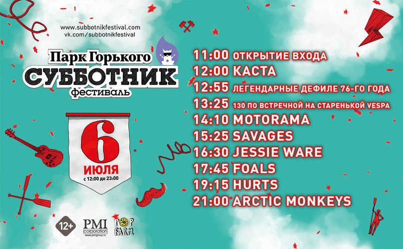 ЦПКиО им. Горького 6 июля 2013 года, суббота 12.00-23.00 6 июля 2013 года Парк Горького станет главной концертной площадкой Москвы. Здесь пройдет первый музыкальный фестиваль «Субботник», организованный концертным агентством Pop Farm и корпорацией PMI совместно с Парком Горького. «Субботник» станет первым музыкальным событием подобного масштаба, проводимым когда-либо на территории Парка Горького. Планируется, что, начиная с 2013 года, фестиваль станет ежегодным. В этом году на «Субботник» приедут группы Hurts, Foals и Savages, а также британская певица Jessie Ware. Откроет «Субботник» cамая известная и влиятельная группа в истории российского хип-хопа, ростовская «Каста». Также на фестивале выступит группа Motorama, чье появление на «Субботнике» станет единственным выступлением в Москве этим летом. Хедлайнером «Субботника» заявлена британская группа Arctic Monkeys, чье выступление в Парке Горького станет первым и единственным в этом году в России и СНГ. Arctic Monkeys – одна из самых успешных групп последнего десятилетия. Первый альбом Arctic Monkeys 'Whatever People Say I Am, That's What I'm Not' (2006) стал самым быстро продаваемым дебютным альбомом в Великобритании за всю историю. За 11 лет существования группы Arctic Monkeys выпустили 4 альбома, неоднократно были номинированы на Grammy, становились лауреатами множества премий (BRIT Awards, NME Awards и других), а также выступили в качестве хедлайнеров на самых крупных фестивалях мира. В настоящее время группа готовит к выходу свой пятый студийный альбом, релиз которого запланирован на середину этого года. Первый альбом группы Hurts, 'Happiness’ (2010), стал одним из самых коммерчески успешных альбомов 2010 года. Наибольшую известность группе принесла песня 'Wonderful Life', видео на которую на YouTube посмотрело более 20 миллионов человек. 11 марта 2013 года Hurts выпустили долгожданное продолжение – альбом 'Exile'. Спустя 2 года после первых российских гастролей Hurts возвращаются в Москву и появятся на «Субботнике» в Парке Горького уже в статусе мировых суперзвезд. Выступление на «Субботнике» станет для Foals первым визитом в Россию. Дебютный альбом 'Antidotes' вышел в 2008 году, после чего группа записала еще 2 альбома, релиз последнего из которых ('Holy Fire') состоялся в феврале 2013 года. Foals славятся своими живыми выступлениями и приедут на «Субботник» в Парк Горького, чтобы продемонстрировать это своим российским поклонникам. Британская певица Jessie Ware получила мировую известность благодаря песне 'Wildest Moments' c дебютного альбома 'Devotion', который по итогам 2012 года попал в Top 10 лучших альбомов многих авторитетных музыкальных изданий. В этом году Jessie Ware выступит на таких фестивалях, как Coachella, Bestival, Primavera, а также впервые приедет в Россию на «Субботник» в Парке Горького. За 16 лет своего существования «Каста» выпустила 7 студийных альбомов, в том числе сольные проекты участников, последний из которых, «Ясно!» (Влади), вышел в 2012 году. 6 июля 2013 года «Каста» своим выступлением откроет первый музыкальный фестиваль «Субботник» в Парке Горького. Место проведения «Субботника», Парк Горького – центральный парк Москвы с посещаемостью более 100 000 человек в выходные и праздничные дни, с 2011 года ставший первым парком мирового уровня в России, пространством для отдыха, спорта и развлечений на свежем воздухе. Продажа билетов на «Субботник» началась 19 марта 2013. На территории фестиваля также будет организована платформа для людей с ог