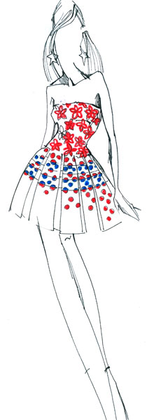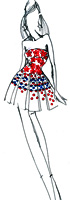 горошек тоже родом из детства. В изящных платьях тонкое кружевное полотно наложено на плотную хлопчатобумажную ткань с атласной выработкой и вафельным рельефом. Декор крупными объемными пуговицами цвет в цвет горошка создает эффект 3D, а чередование полос со смещением узора на юбке в складку– впечатление волнообразного движения. Жизнерадостная красно-сине-белая гамма плавно вписывается в контекст модных весенне-летних трендов.
