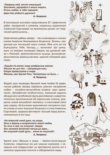 В экспозиции выставки представлены авторские серии: «Россия и Греция», «Он и она», «Музыка и мода» – 70 графических работ, настроений и сюжетов, созданных художником Алевтиной Стручковой на протяжении 10 лет творческой деятельности.