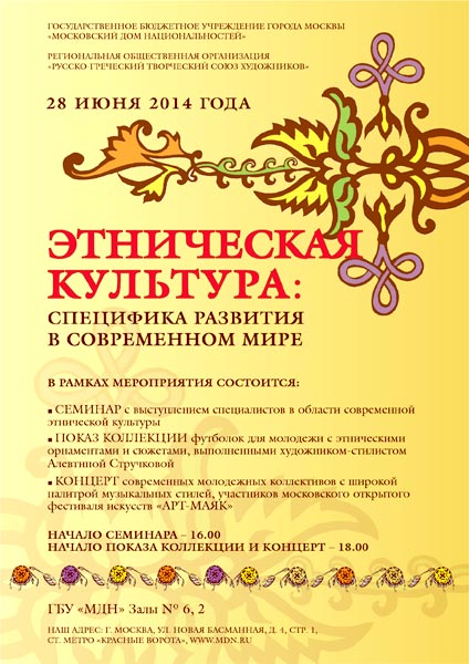 СОСТОИТСЯ ПОКАЗ КОЛЛЕКЦИИ ФУТБОЛОК художника-стилиста АЛЕВТИНЫ СТРУЧКОВОЙ «SOLAR PARTY! Summer 2014» Мероприятие пройдет в рамках Семинара «Этническая культура: специфика развития в современном мире» при поддержке Правительства Москвы и Русско-греческого творческого союза художников. Будет представлена коллекция для молодежи с этническими орнаментами и сюжетами, выполненными художником-стилистом, продюсером Московского открытого фестиваля искусств «АРТ-маяк» Алевтиной Стручковой. Коллекция является логическим продолжением выставки графических работ «Россия-Греция», состоявшейся в ноябре 2013 г. в ГБУ «Московский дом национальностей». Экспонируемые на выставке авторские рисунки, созданные в технике черно-белой графики, обрели новую жизнь в орнаменте футболок дизайнера. На Вечере также будет представлена выставочная экспозиция сувенирной продукции, созданной по эскизам художника-стилиста Алевтины Стручковой. Показ состоится при участии современных молодежных коллективов с широкой палитрой музыкальных стилей и направлений: