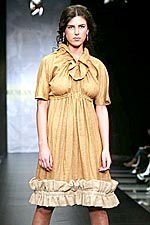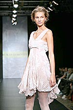 В трех строках: легкая небрежность, мешковатость формы; податливость льна, полёт шифона и интрига кружева; деликатность цвета, как цветок сакуры в туманное утро. Юная Дульсинея в платье-трапеции с подхватом под грудью, карманами-овалами, оборкой у горловины. Сквозь всю форму – молния, как аксессуар. Чуть холодное лето акцентирует цветом обуви, играет темой платьев: а-ля халат или ночная сорочка, а-ля мешок или парашют. Немного мягких складок, доминанта мини, гибкость тела и материала... В крое - женственность рельефных линий, аппликативность и динамика
