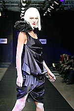 Влекущие ночи Кабирии не забыть. В мерцающих сумерках раскрывается грандиозный цветок формы. Пластичный шелк шуршит у коленей, мрачным каскадом ниспадает атлас. Своевольная лента обвивает тело. Широкополая шляпа с тяжелыми полями скрывает ту, что разводит голубей и поднимается на крыши в платье а-ля смятая простыня. Алый рот распускается на бледном лице. Это Джульетта Мазини в атракционно-фееричном платье-футляр, в котором декольте – качели и мини в фаворе. Ловкие пальчики марионеточницы ломают подолы юбок. Ткань живет своей жизнью. Крой – свободная геометрия. Здесь нет правил, только желание иллюзорного и обманчивого. Интеллектуально-угловатые формы в ритме победительном, напористом и агрессивном.
