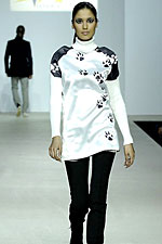 Она сексуальна и тонка, как сладкая косточка. Способствуют – плащ, перетянутый по талии, короткая юбка и вязаная шапочка. Авантюрна – отстегивает низ пальто, превращая его в жакет с объемным воротником. Игрива и спортивна – сочетает мех и трикотаж, атлас, органзу и бархат. Шедевр: маленькое белое платье с оттиском золотых косточек, лучшая награда на выставке Ваших достижений. И следы, следы повсюду.