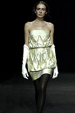 Из благодарной шерсти, чесучи, ламе и органзы, как из пластилина, лепятся невиданные объемные формы и неповторимые образы. В платье-корсет, юбка образуется глубокими складками-конвертами. В шифоновом платье чередуется ряд защипов и драпировок. Юбки расшиваются вручную пайетками и блестками. Узкие брюки сопровождают сарафан на многослойных бретелях. Символ ранимости и невинности – платье-бутон, подхваченное по талии широким поясом. Забытая сказка о принцессе на горошине оживает в талантливо-новом прочтении.