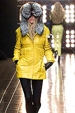 Куртки теперь только до талии на трикотажной резинке. Складки, хитро заложенные в непредсказуемых местах, строят форму. Но Марлен Дитрих не была бы столь пикантна без перчаток «в локоть» и лимонной пилотки. Мех – вот еще одна ее слабость! Куртка-баллон из серебристой лисы с желтым поясом. Меховой прямоугольник платья-жилет перехвачен по талии широким ремнем. Все это поверх глухой водолазки и лосин. Обувь-лак на высокой платформе.