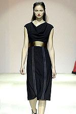 Юбка с односторонними складками. Аскетичная блузка с глухим воротником-стойкой. Жакет свободный до бедра, стойка на вырезе «лодочка», широкий рукав перехвачен манжетой. Женственное пальто, с акцентом талии, мягкие складки, маленькие выточки. Все изменения формы происходят за счет складок и драпирования ткани по принципу «оригами». Будни светлые, петербургские. Сарафан – альтернатива юбке-блузке, но в отличие от платья позволяет играть с футболками. Ткани мягкие, бежевый атлас, графический рисунок. Если цветы, то в тон основного цвета.