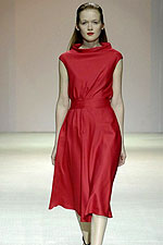 Алое платье из податливой шерсти, вокруг талии в несколько оборотов пояс, сзади на бант, полотнище драпируется в асимметричные складки-лучи. Пальто до середины икры, мягкое, пластичное, со смещенной застежкой на бант, пряжку или крупные пуговицы. Минимализм! Ура!