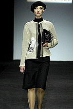 Ценности меняются местами: одежда выворачивается на изнанку и оригинальничает загадочными принтами. Мастер «помещает» старинные тексты на вязаный кардиган, для смелости прячет фляжку в круглые накладные карманы брюк. Он спешит к ней и растворяется в черно-бело-красной гамме чувств. Аппликативность, как прием декора, дробит образ на акценты и ассоциирует к агитационному плакату. Берет, трикотажная блузка, жилет с рюшами, юбка-баллон с рисунком-шрифт, сапоги... Все легкомысленно забыто, в угоду обнаженности и полету над городом. Прошлое возвращается, стоит только перевести часы, встроенные в ридикюль или набрать заветный код на клавиатуре, украшающей сумочку.